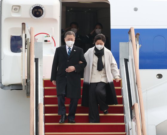 문재인 대통령과 김정숙 여사가 지난 22일 6박8일간의 중동 3개국 순방을 마치고 서울공항에 도착해 공군 1호기에서 내리고 있다. [청와대사진기자단]