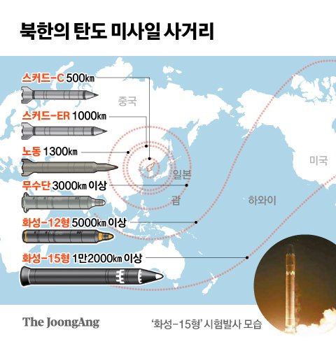 북한의 탄도 미사일 사거리 그래픽 이미지.