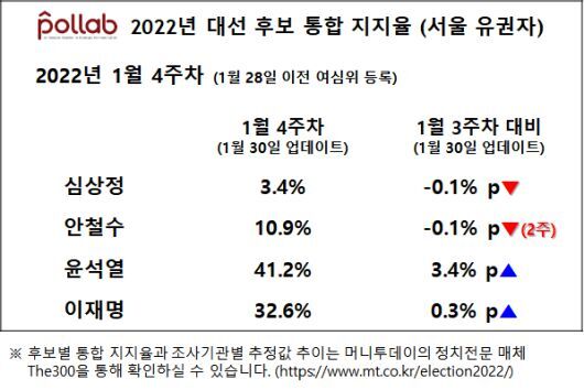 1월 넷째 주 현재 중앙선거여론조사심의위원회(여심위)에 등록된 지지율 여론조사를 전수 분석한 결과 윤석열 국민의힘 대선후보의 통합 지지율이 40%대로 올라섰다. 여전히 30% 중후반대 박스권에 갇혀 있는 이재명 더불어민주당 후보와 격차를 벌렸다. 설 명절을 앞두고 두 후보는 각종 쇄신안과 공약을 쏟아내며 총력전을 벌였지만 윤 후보가 꾸준한 상승세를 보이는 반면 이 후보는 박스권 탈출에 계속 어려움을 겪는 모양새다.