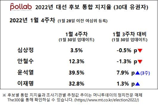 30일 머니투데이 더300[the300]이 한규섭 서울대 언론정보학과 교수 연구팀에 의뢰해 분석한 결과(https://www.mt.co.kr/election2022/ 참조)에 따르면 두 후보의 통합 지지율은 이 후보 36.7%, 윤 후보 40.2%로 분석됐다. 안 후보는 10.0%, 심상정 정의당 후보는 2.8%를 각각 기록했다.