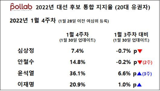 | “李 33.2%-尹 37.8%” “李 33%-尹 32.5%”… 설 연휴 초반 여론조사 접전 (0) | 2022.01.31 |