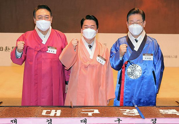 이재명 더불어민주당, 윤석열 국민의힘, 안철수 국민의당 대선후보가 1월 17일 서울 중구 프레스센터에서 열린 2022 재경 대구경북인 신년교례회에서 기념촬영하고 있다. photo 뉴시스