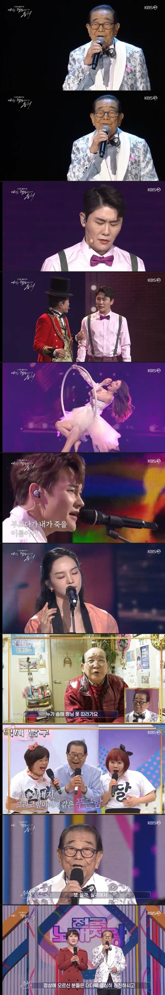 젊은 시절 송해로 분한 또 한 명의 가수 신유와 설하윤은 '당신이 좋아'를 열창, 흐뭇한 모습을 자아냈다. 그 뒤 송해는 직접 무대로 올라왔다. 그는 "남이 보기도 좋았고 멋있었다, 그저 불효를 등에 지고 정처없이 떠나와서 온갖 것 다 해봤다"면서 "온갖 것 다 해봤다"고 지난 세월을 회상했다.