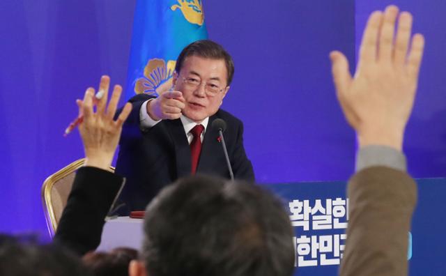 문재인 대통령이 1월 14일 청와대 영빈관에서 열린 신년기자회견에서 질문을 위해 손을든 기자를 지목하고 있다. 왕태석 선임기자