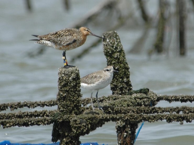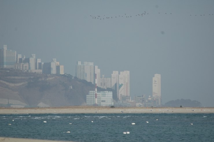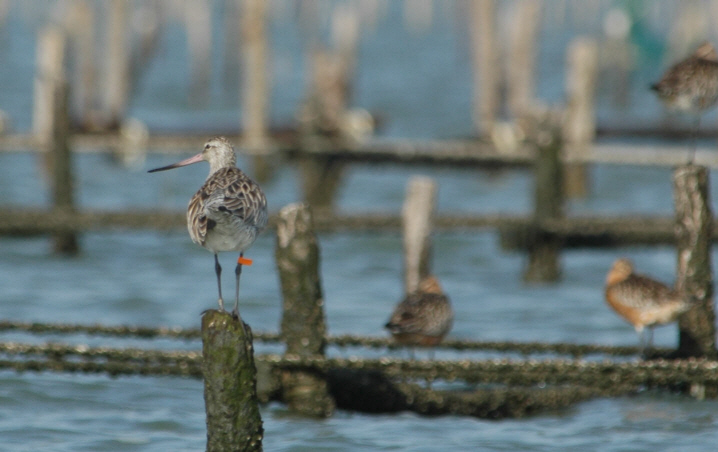 높은 갯벌은 모두 매립되어 많은 도요새들이 양식장 말뚝이나 줄 위, 혹은 제방 위에서 불안하게 휴식을 취한다- 육지 쪽에서는