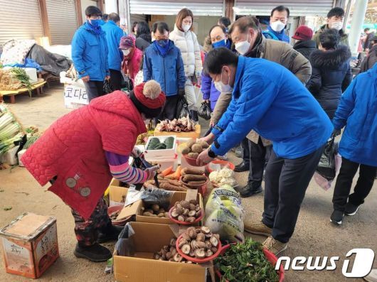 서삼석 의원(전남 영암·무안·신안)이 31일 설 대목장이 열린 영암읍 전통시장에서 물건을 구입하며 민심을 듣고 있다.2022.1.31© 뉴스1