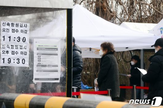 설인 1일 오전 광주 남구보건소 선별진료소에서 시민들이 신속항원검사를 받기 위해 줄지어 서 있다. 2022.2.1/뉴스1 © News1 정다움 기자