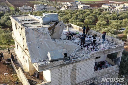 [아트메흐=AP/뉴시스]3일(현지시간) 시리아 이들립주 아트메흐 마을의 한 가옥에서 미국 군사 작전이 끝난 후 잔해 조사가 이뤄지는 모습. 2022.02.03. photo@newsis.com