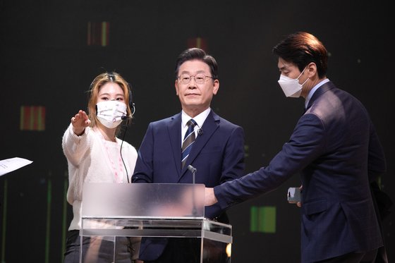 이재명 더불어민주당 대통령 후보가 지난 3일 저녁 서울 영등포구 KBS 공개홀에서 열린 지상파 방송 3 (KBS·MBC·SBS) 합동 초청 대선후보 토론회 시작에 앞서 리허설을 하고 있다. [국회사진기자단]