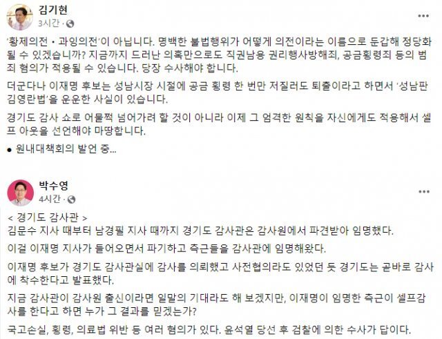 박수영 국민의힘 의원도 이에 가세했다. 그는 이날 자신의 페이스북에서 경기도 감사관에 대해 “김문수 지사 때부터 남경필 지사 때까지 경기도 감사관은 감사원에서 파견 받아 임명했지만, 이재명 지사가 들어오면서 파기하고 측근들을 감사관에 임명해왔다”며 “이재명 후보가 경기도 감사관실에 감사를 의뢰했고 사전협의라도 있었던 듯 경기도는 곧바로 감사에 착수한다고 발표했다”고 했다.