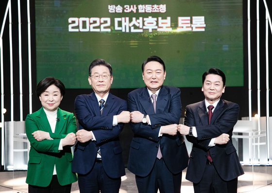 지상파 방송 3사가 공동주최한 대선후보토론회가 열린 지난 3일 서울 KBS 스튜디오에서 심상정 정의당 대선 후보, 이재명 더불어민주당 대선 후보, 윤석열 국민의힘 대선 후보, 안철수 국민의당 대선 후보가 리허설 중 기념촬영을 하고 있다. [국회사진기자단]