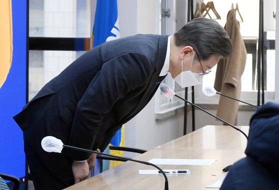 이재명 더불어민주당 대선 후보가 4일 서울 여의도 중앙당사에서 226개 기초지자체 공약을 소개하는 '우리동네공약' 언박싱데이 종료 후 부인 김혜경 씨 관련 과잉 의전 논란과 관련해 ″국민들께 다시 한 번 사과드린다″며 고개를 숙이고 있다. 뉴시스