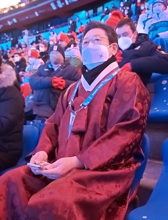 황희 문화체육관광부 장관이 4일 오후 중국 베이징 국립경기장에서 열린 2022 베이징 동계올림픽 개회식에 한복을 입고 참석해 있다. [문화체육관광부]