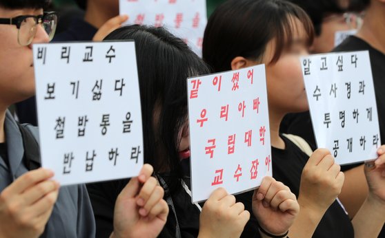 전북대 학생들이 지난 2019년 7월 19일 이 대학 학생회관 앞에서 비리 교수 징계 및 재발 방지 대책 촉구 기자회견을 하고 있다. 뉴스1