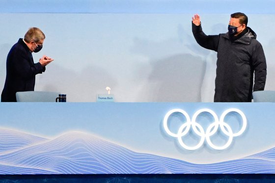 지난 4일 중국 국가체육관에서 열린 베이징 겨울 올림픽 개막식에서 귀빈석에 입장하는 시진핑(오른쪽) 중국 국가주석에게 토마스 바흐(왼쪽) 국제올림픽 위원회(IOC) 위원장이 고개 숙여 인사하고 있다. [AFP=연합뉴스]