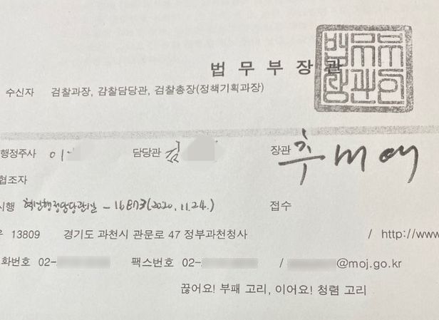 이 문서 하단에 표시된 결재자를 보면 ‘이모 행정주사, 김모 담당관, 추미애 법무부 장관’ 3명이다. 이 사안과 관련한 법무부 담당 간부인 심우정 기조실장은 아예 결재란에서 빠져 있다. 정부 부처에서는 공문서를 기안할 때 전자문서(온라인)에서 결재자를 미리 선택해 문서 하단에 넣고, 이후 결재를 올리면 순서대로 각각 결재 서명을 한다. 그런데 심 실장은 해당 안건을 논의하는 과정에서 반대 의견을 표시했고, 이런 이유로 아예 문서 결재 라인에서 배제된 것으로 알려졌다. 따라서 해당 공문서 결재자에 검사는 한 명도 없고, 법무부 일반직 공무원인 행정주사와 담당관, 그리고 추 장관만 있다. 심 실장은 법무부 검찰과 검사, 형사기획과장, 검찰과장 등을 역임하며 누구보다 검찰 관련 법무부 업무에 정통하다는 평을 듣는 현직 검사장이다.