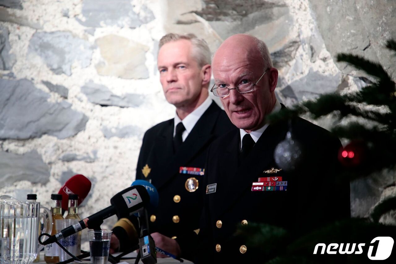 닐스 안드레아스 스텐쇠네스 해군 참모총장(왼쪽)이 2018년 11월 29일(현지시간) 노르웨이 오슬로에서 발생한 KNM 헬게 잉스타드호 사고와 노르웨이 프리깃함의 충돌 사고과 관련한 연설에 참석하고 있다. © AFP=뉴스1 © News1 김지현 기자