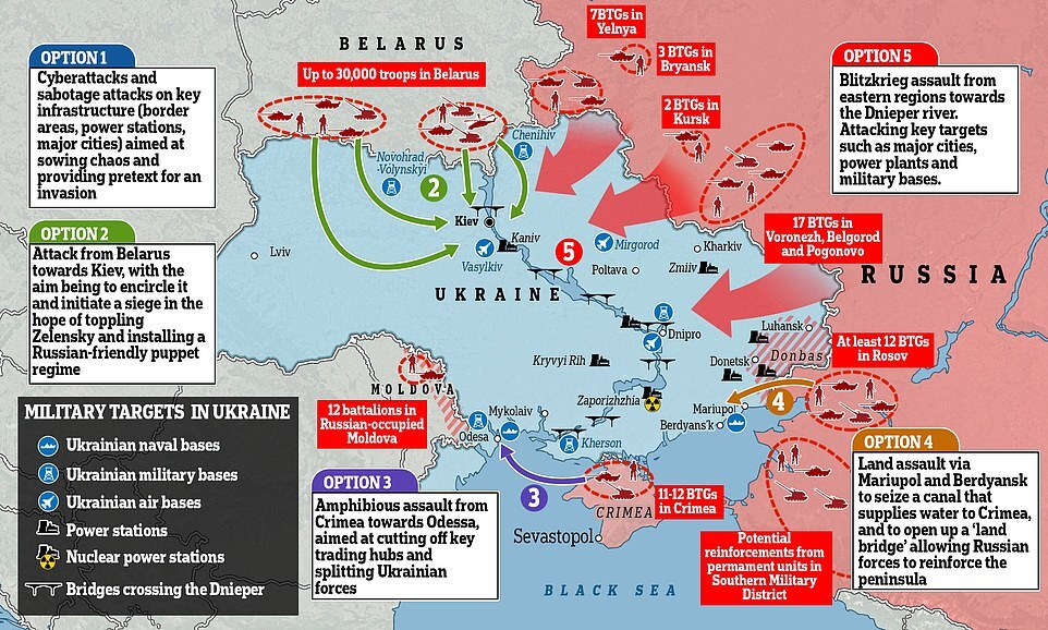 Meanwhile, Norwegian vice admiral Nils Andreas Stensones said the Russians 'have all they need to carry everything out, from a minor invasion in the east to minor attacks here and there in Ukraine, or a complete invasion, with, possibly, an occupation of all or parts of Ukraine'.