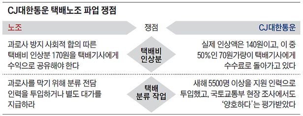 택배노조는 인상된 택배 요금을 택배기사의 수익으로 돌려줄 것을 요구하고 있다. 택배기사 과로사 방지를 위한 사회적 합의 이후 회사가 택배 요금 170원을 올렸으나, 택배기사에게 돌아온 몫이 적다는 주장이다. 하지만 CJ대한통운은 실제 인상 요금은 140원이었고, 이 중 50~55%가 택배기사의 몫으로 돌아가고 있다고 반박하고 있다.