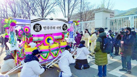 지난 28일 정부과천청사 앞 추미애 법무부 장관 규탄 집회에 ‘근조 민주주의 사망’이라고 적힌 현수막을 두른 꽃상여 차량이 등장했다. [사진 자유연대]