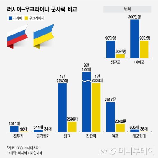 하지만 러시아군의 위력은 매우 위협적이라는 분석이 지배적이다. 러시아는 대규모 지상군 배치 없이도 우크라이나 정규군에 상당한 피해를 입힐 것이라고 WSJ는 봤다. 러시아가 미국처럼 한 건물의 오른쪽 창문을 파괴할 정도의 정밀 타격 기술은 없어도, 건물 전체를 날릴 정도의 공격력은 충분하다는 해석도 있다.