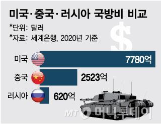 국방 예산 규모도 현저히 떨어진다. 세계은행 자료에 따르면 2020년 기준 러시아는 620억달러(74조원)를 국방비로 지출했다. 이는 미국 7780억달러(993조원)의 12분의 1, 중국 2523억달러(303조원)의 4분의 1 수준에 불과하다.