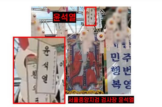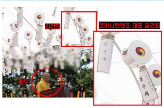 또 “이 일탈의 현장에서 윤석열-김건희 부부의 존재를 확인했다. 이날 행사에서 인사말을 하는 건진의 스승 혜우의 머리 위로 ‘코바나 콘텐츠 대표 김건희’의 이름이 적힌 등을 확인했다. 그 옆에 나란히 걸려 있는 ‘서울지방검찰청 검사장 윤석열’의 이름이 적힌 등도 확인했다”고 설명했다.