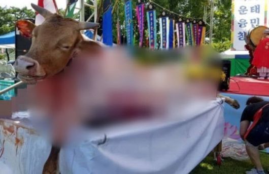 행사 당시 가죽 벗긴 소 사진.