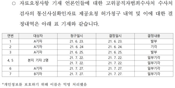 공수처는 A기자와 같은 회사에 소속된 B기자에 대해서도 지난해 7월 27일 통신영장을 청구했다. 그로부터 닷새 전인 7월 22일엔 본지 소속 기자 2명 대해서도 통신영장을 청구했다. 일주일이 채 안되는 기간에 기자 4명의 통신내역을 강제로 들여다보겠다고 법원에 요청한 건데, 법원은 이를 모두 일부 기각했다.
