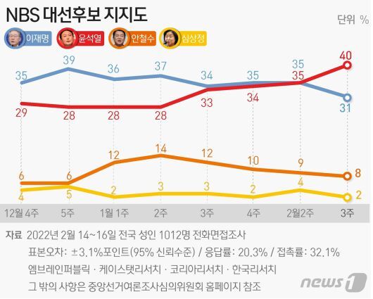 엠브레인퍼블릭·케이스탯리서치·코리아리서치·한국리서치 여론조사업체 4개사가 만 18세 이상 성인 남녀 1012명을 대상으로 지난 14~16일 실시한 2월 3주차 전국지표조사(NBS) '대선 후보 지지도'에서 윤 후보는 40%를 기록하며 31%의 이 후보에게 9%포인트(p) 차이로 앞섰다. 두 후보의 격차는 오차범위(95% 신뢰수준에서 ± 3.1%p)를 넘어서는 수치다.