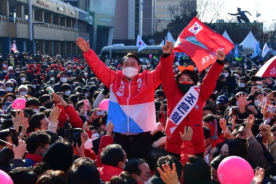 윤석열 국민의힘 대선후보가 17일 서울 서초구 고속버스터미널에서 열린 '공정, 상식, 법치의 대한민국!' 서초 유세에서 조은희 서초갑 재보궐선거 후보와 함께 지지자들을 향해 두손을 들어 보이고 있다.김상선 기자
