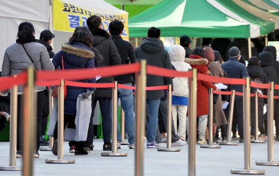 17일 대전의 한 보건소 코로나19 선별진료소를 찾은 시민들이 신속항원과 PCR검사를 받기위해 차례를 기다리고 있다. 김성태