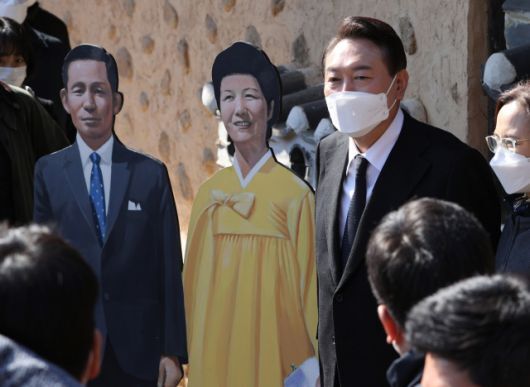 ▲국민의힘 윤석열 대선후보가 18일 오후 경북 구미시 박정희 전 대통령 생가를 찾아 박 전 대통령 부부 등신대 모형 옆에서 사진촬영을 하고 있다. ⓒ연합뉴스