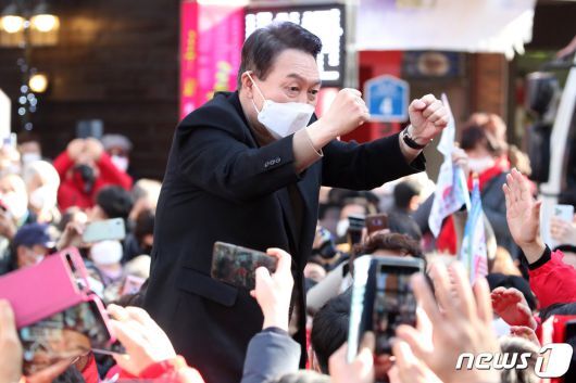 (서울=뉴스1) 김일창 기자,윤수희 기자,김유승 기자 = 공식 선거 운동(15일)이 시작하기 직전 오차범위 내 지지율 '초접전' 양상이었던 판세가 이후 윤석열 국민의힘 대선 후보에게 유리하게 흐르고 있다.