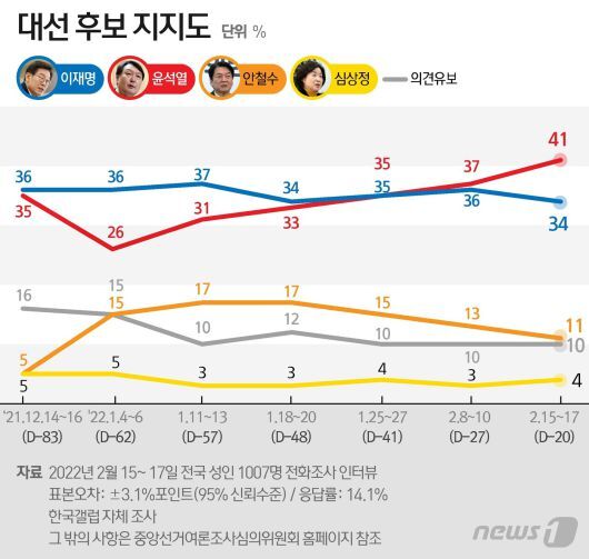 여론조사 전문기업 한국갤럽이 지난 15~17일 전국 만 18세 이상 1007명을 대상으로 '대선 후보 지지도'를 조사한 결과 윤 후보는 41%, 이재명 더불어민주당 후보 34%, 안철수 국민의당 후보 11%, 심상정 정의당 후보 4%의 지지율을 기록했다.