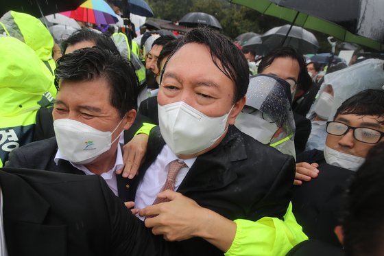 윤석열 국민의힘 대선 후보가 경선 후보이던 지난해 9월 17일 오전 경북 구미시 박정희 전 대통령 생가를 찾아 추모관 참배를 마친 뒤 경찰의 호위를 받으며 생가를 떠나고 있다. 뉴스1