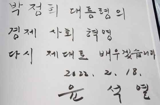 박 전 대통령 추모관에 들어서서 초상화 앞에 헌화·분향한 윤 후보는 묵념 한 뒤 방명록에 “박정희 대통령의 경제사회 혁명, 다시 제대로 배우겠다”라고 적었다.