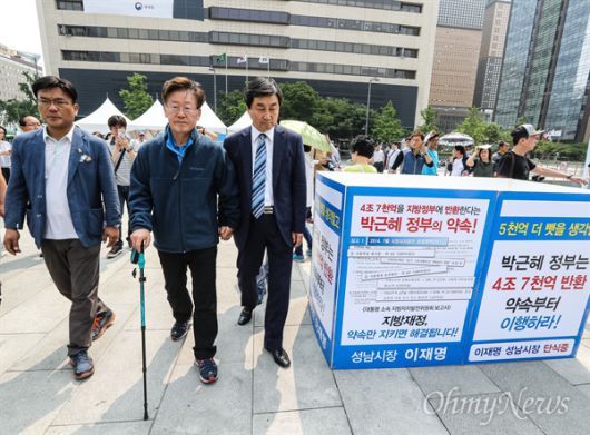 이재명 성남시장, 11일만에 단식농성 중단 ▲ 2016년 6월 17일 오전 지방재정 개편안 철회를 촉구하며 광화문광장에서 11일째 단식농성을 벌이던 이재명 성남시장이 "당에서 책임지고 해결하겠다"는 김종인 더불어민주당 비대위대표의 요청을 받아들여, 단식농성을 중단하고 분당보건소 구급차를 타고 병원으로 향했다. 지팡이를 짚은 이재명 시장이 이종걸 더불어민주당 원내대표와 함께 구급차로 향하고 있다. ⓒ 권우성