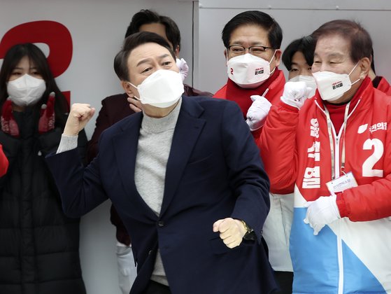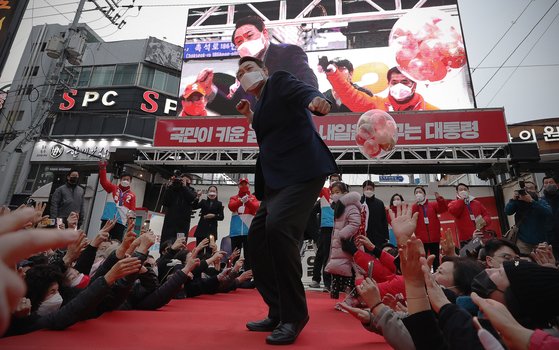 (울산=뉴스1) 윤일지 기자 = 윤석열 국민의힘 대선 후보가 19일 오전 울산 남구 롯데백화점 울산점 앞 광장에서 열린 유세에서 어퍼컷 세리머니를 펼치며 지지를 호소하고 있다. 뉴스1