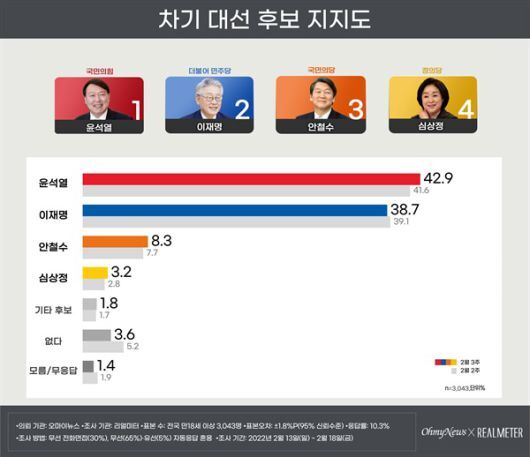 오마이뉴스-리얼미터 2월 3주차 주간 집계 결과, 차기 대선후보 지지도 조사(4자 대결)에서 윤석열 국민의힘 후보 42.9%, 이재명 더불어민주당 후보 38.7%로 나타났다. 두 후보의 격차는 4.2%p로 오차범위(95% 신뢰수준에서 ±1.8%p)를 벗어났다. 직전 조사(2월 2주차)보다 윤 후보는 1.3%p 상승했고, 이 후보는 0.4%p 하락 횡보했다. 이어 안철수 국민의당 후보 8.3%(▲0.6%p), 심상정 정의당 후보 3.2%(▲0.4%) 순이었다. 기타 후보 1.8%, 부동층(없다+모름·무응답)은 5.0%였다. (아래 후보 호칭 생략)