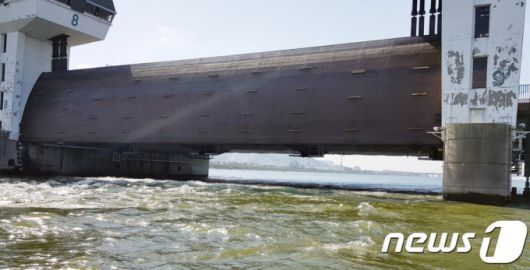 = 지난 2017년 5월22일 한국수자원공사 낙동강 중부물관리센터가 대구 달성군 강정고령보에 수문을 열고 물을 방류하고 있다. 문재인 대통령은 이날 4대강 16개 보 가운데 녹조 발생이 심하고 수자원 이용측면에서 영향이 적은 6개 보를 오는 6월1일부터 상시 개방하라고 지시했다. 2017.5.22/뉴스1