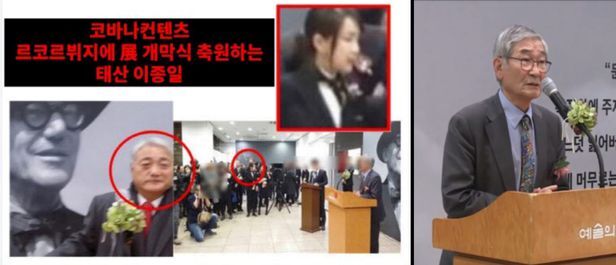 그래서 윤 후보 측에 물어봤다. 윤 후보 관계자는 “이씨가 사진을 찍은 장소는 개막식때 연단을 놓긴 했지만, 기본적으론 배경에 르 코르뷔지에가 그려진 ‘포토존’이며, 원래 기념촬영을 하는 곳”이라며 “이씨 사진이란 게 어떻게 나왔는지 우리로서는 확인할 길이 없지만, 실제 축사를 맡은 것으로 확인된 귀빈들의 사회적 지위와 당시 영상 등을 보고 상식적으로 판단해달라”고 했다.