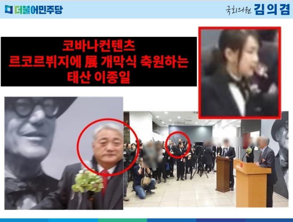김 의원이 지목한 행사는 2016년 12월 6일 서울 서초구 예술의전당 한가람미술관에서 열렸던 ‘르 코르뷔지에 전(展)’ 개막식이다. ‘현대건축의 아버지’로 불리는 프랑스 건축가 르 코르뷔지에의 회화, 드로잉, 조각, 설계도면 등을 전시한 행사였다. 이듬해 3월까지 진행된 이 전시에는 비공식 집계로 12만명 이상이 다녀갔다고 한다.