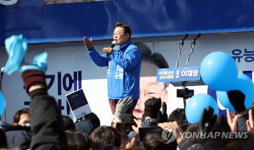 (안양=연합뉴스) 하사헌 기자 = 더불어민주당 이재명 대선 후보가 20일 오후 경기도 안양시 안양중앙공원에서 열린 "'안양'하세요, 이재명과 발전하는 경기 남부!" 안양 유세에서 연설하고 있다. 2022.2.20 toadboy@yna.co.kr