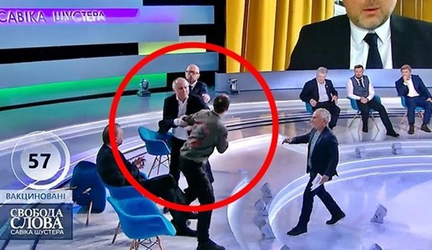 현 정국에서 가장 자주 언급되는 주요 인사들이 모두 모인 자리인 만큼 토론에 대한 관심은 엄청났다. 특히 분리주의자 자금조달 혐의를 받고 출국해 폴란드 바르샤바에 머물다 얼마 전 귀국한 친서방 노선의 포로셴코 전 대통령, 또 푸틴 러시아 대통령이 우크라이나 점령 정부 수장으로 점찍었다는 소문의 주인공 예브게니 무라예프 '나시' 정당 대표의 만남이 흥미로웠다.그러나 시간이 갈수록 토론 분위기는 험악해졌다. 특히 언론인 유리 부투소프가 네스토르 슈프리치 의원의 뺨을 갈기면서 토론은 아예 중단됐다. '푸틴 러시아 대통령이 살인자이자 범죄자라는 사실에 동의하느냐'는 질문을 받은 슈프리치 의원이 "우크라이나 정부당국이 처리하도록 내버려두자"고 답변을 거부한 뒤 벌어진 일이다.