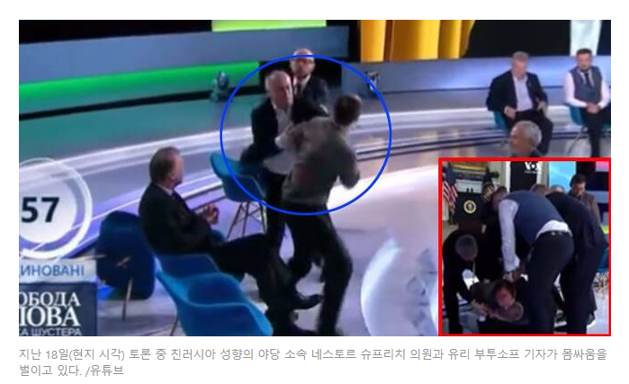 이에 토론 패널로 참석한 페트로 포로셴코 전 우크라이나 대통령은 난투극이 끝난 뒤에 “이 스튜디오에 러시아 요원이 있다”면서 슈프리치 의원을 저격했습니다.