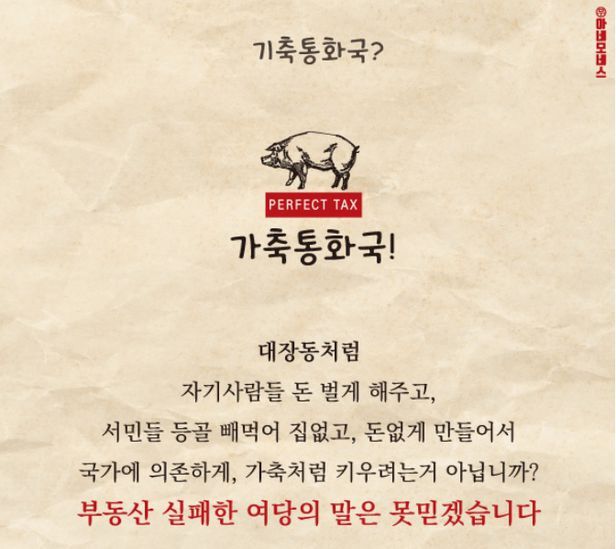 또 다른 네티즌은 ‘기축통화국? 가축통화국!’이라는 패러디 게시물을 통해 “대장동처럼 자기 사람들 돈 벌게 해주고, 서민들 등골 빼먹어 집 없고, 돈 없게 만들어서 국가에 의존하게, 가축처럼 키우려는 거 아닙니까”라고 했다.