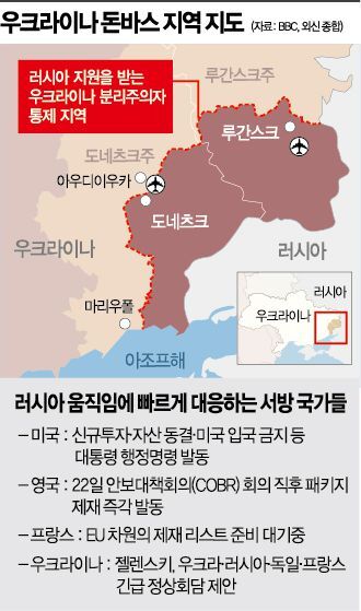 미국 등 서방은 러시아가 이 두 공화국의 독립을 승인한 것은 심각한 국제법 위반이라고 강력히 비난하면서, 즉각적인 제재를 서두르고 있습니다.