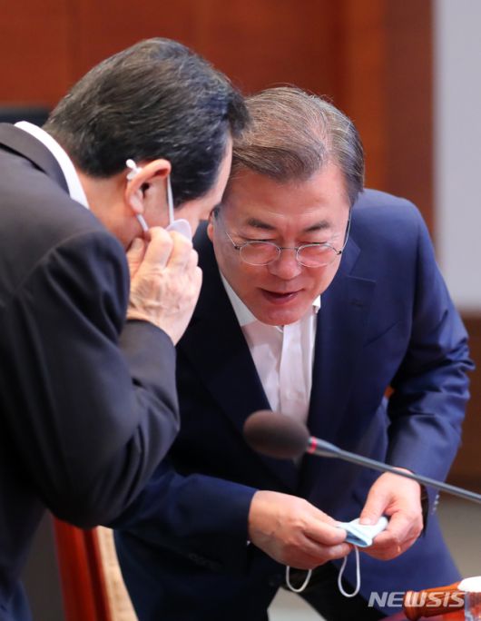 [서울=뉴시스배훈식 기자 = 문재인 대통령이 지난 7월7일 청와대 여민관에서 열린 국무회의에 참석해 정세균 국무총리와 대화하고 있다. 2020.07.07.