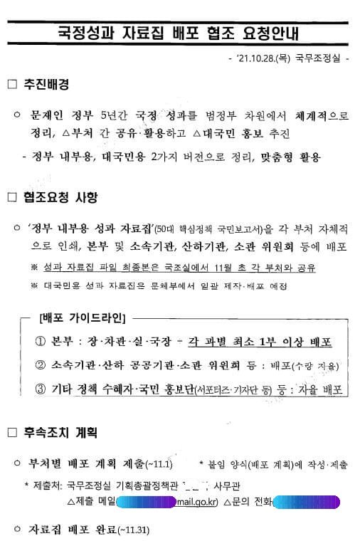 국무조정실이 지난해 10월 28일 ‘국정성과 자료집 배포 협조 요청안내’라는 제목으로 각 부처에 비공개로 내려보낸 공문. 국민의힘은 이를 근거로 “정부가 성과 홍보를 통해 대선에 개입하려 한다”고 주장하고 있다. 국민의힘 백종헌 의원실 제공